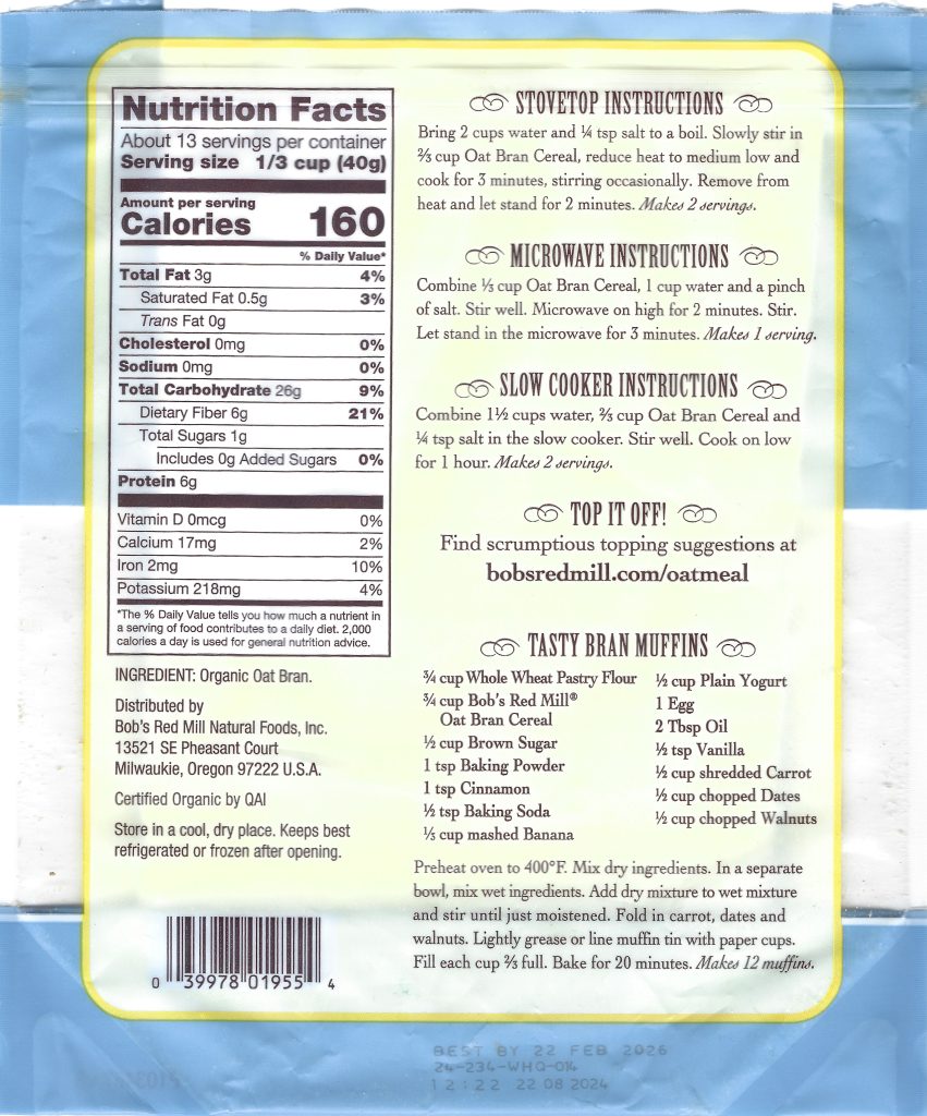 Combine 1/3 cup Oat Bran Cereal, 1 cup water and a pinch of salt. Stir well. Microwave on high for 2 minutes. Stir. Let stand in the microwave for 3 minutes. Makes 1 serving.